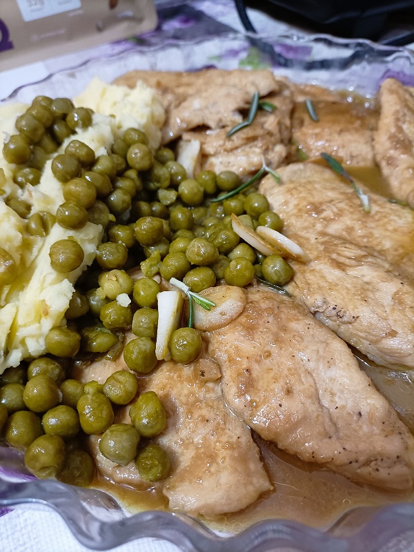 Servimos el pollo a la mostaza junto al puré de patata y añadimos los guisantes.